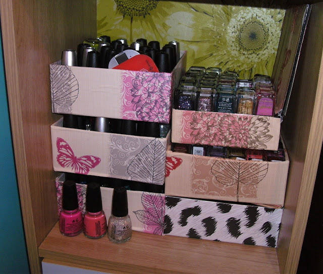 As it goes, I have my OPI on the top shelf, Nails Inc in the middle (with an added box of Illamasqua/Butter London) and China Glaze/Barry M/MAC on the bottom shelf. I also have 4 draws where I generally keep my drugstore or misc polishes. And yes, those are Glossybox boxes with wallpaper/border glued to them hahaha.